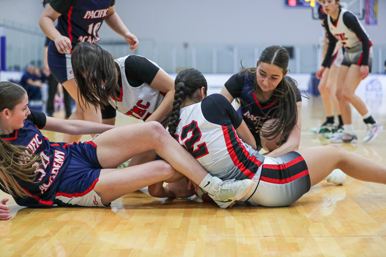 St. Thomas More Collegiate and Pacific Academy players battle for a loose ball during quarter-final play at the BC School Sports 2A Girls Basketball Provincial Tournament. Vancouver Sports Pictures photo