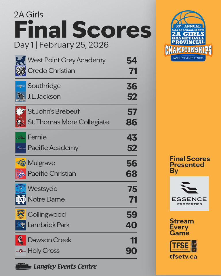Holy Cross Crusaders (#1, Surrey) 85 Westsyde Whundas (#13, Kamloops) 52