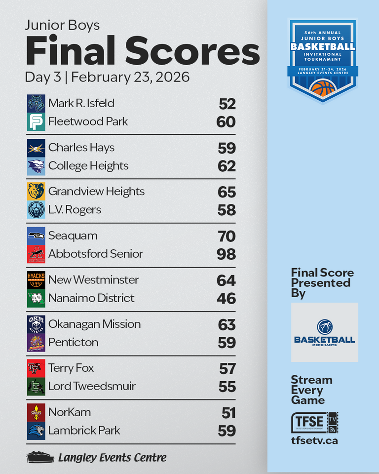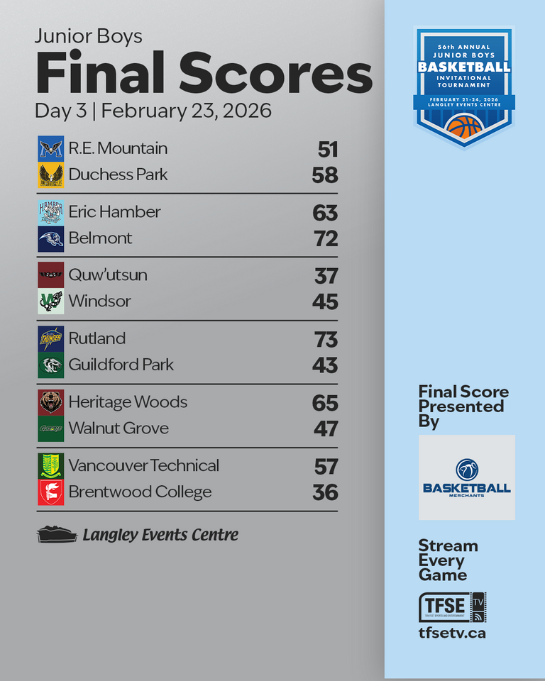 Top-seeded Vancouver College will meet No. 2 Burnaby South in the championship final of the 2026 Junior Boys Basketball Invitational Tournament on Tuesday (Feb. 24) at 7:00 p.m. on South Court at Langley Events Centre.