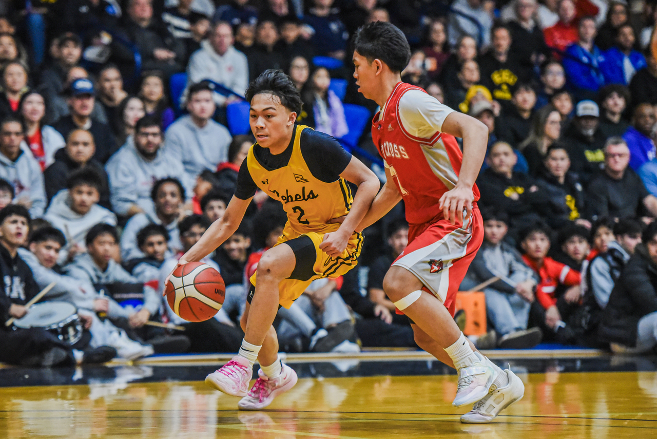 Caelan Relova (#2) and the Burnaby South Rebels are off to the championship game following a 76-64 win over the Holy Cross Crusaders. Ryan Molag photo