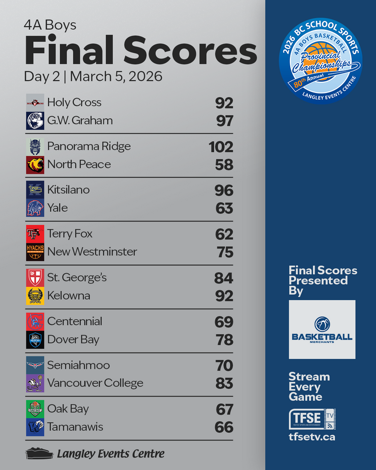 Tickets are available for purchase and every game of all four championships is also available to stream through pay-per-view at TFSETV.ca. Daily schedules, scores and news can also be found at www.bchighschoolbasketballchampionships.com.
